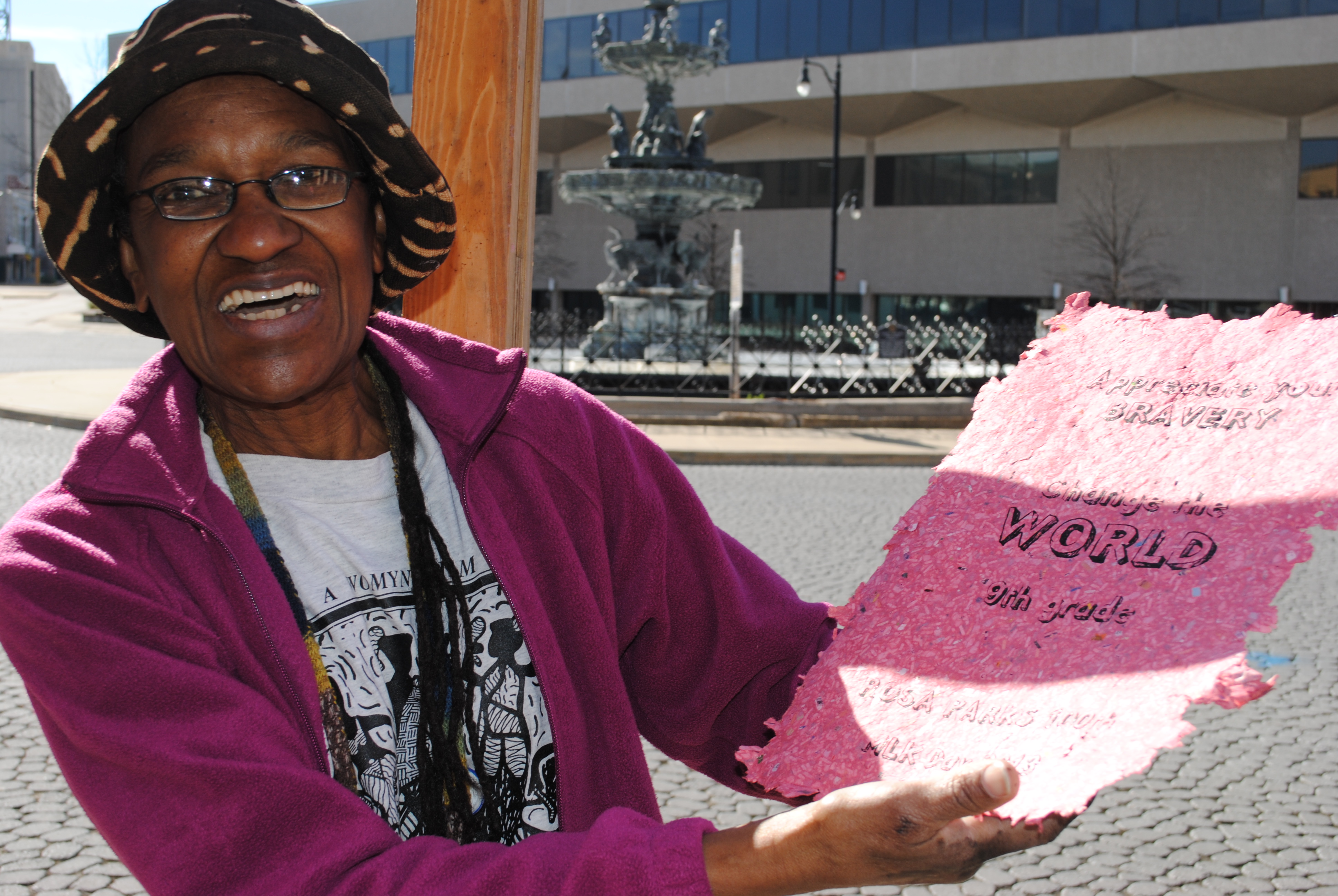 The scarlet paper-making pavillion became a crossroads of hands-on civic engagement, as wishes inspired by Rosa Parks life works were drafted and handmade paper was created for the posters that will broadcast these wishes as messages, as art across the neighborhoods of Montgomery in honor of her upcoming 100th birthday.